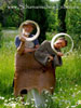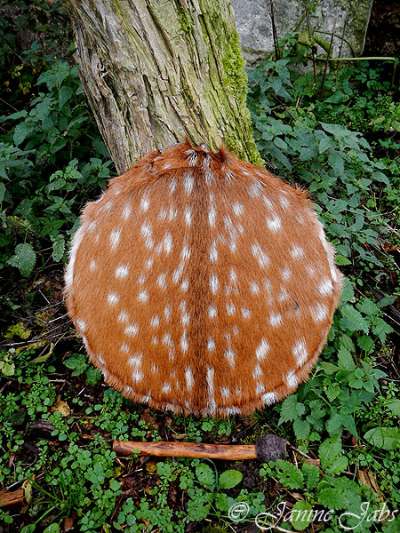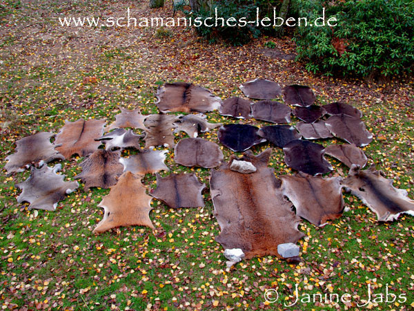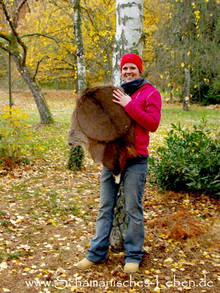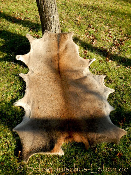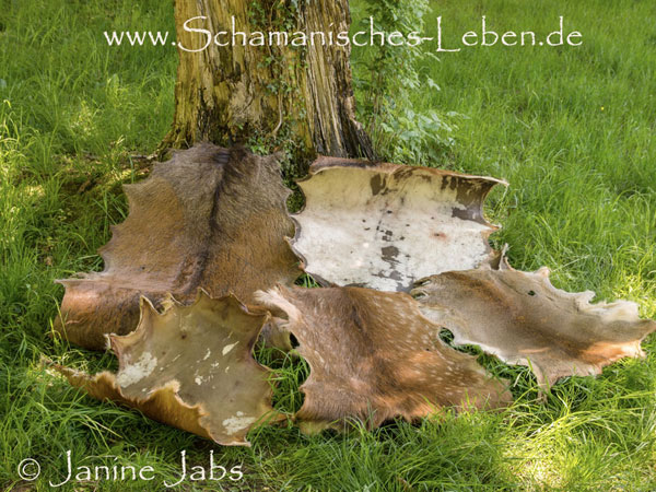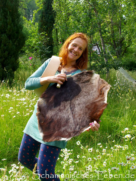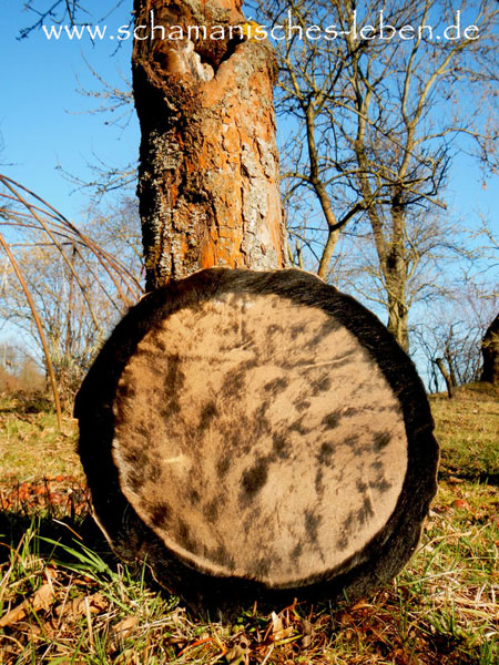 Je nach Verfügbarkeit und Wunsch wird die Rahmentrommel mit Ziegen-, Reh-, Mufflon- oder Hirsch(kuh)haut bespannt.