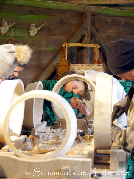 Ganz nach schamanischen Grundsätzen werden die Bestandteile der Rahmentrommeln in "Urproduktion" hergestellt.