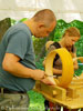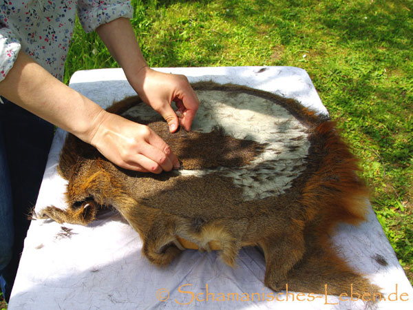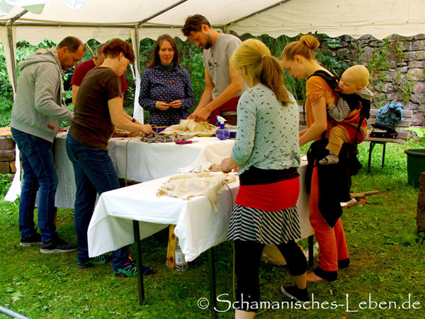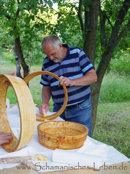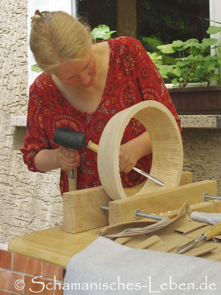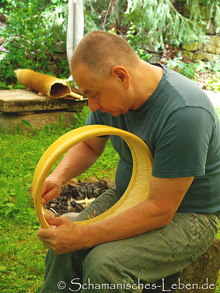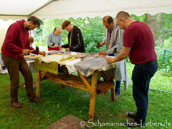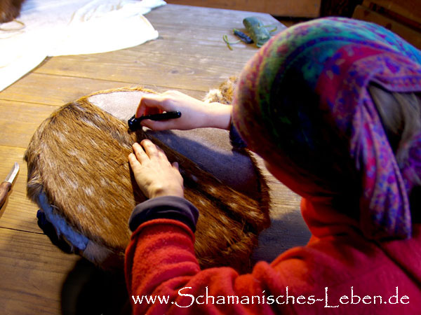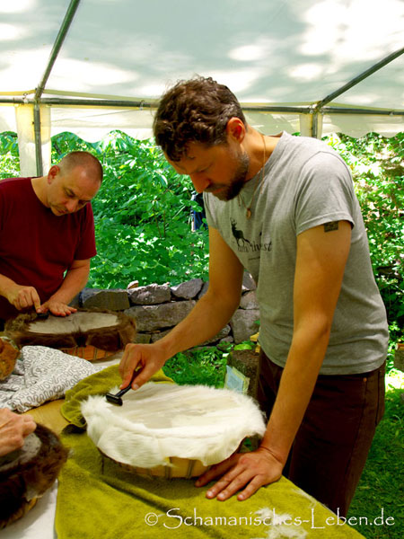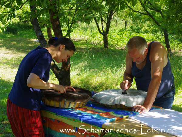Besonders auch auf diesem Weg findet bereits eine starke Verbindung zwischen der Trommel und ihrem Besitzer statt, denn jeder Teilnehmer gibt während dieses Arbeitsschrittes seine ihm eigene "Handschrift" und Kraft hinzu.